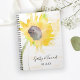 Customisez le joli Tournesol Jaune sur Mariage d'aquarelle blanche Carnet Spiral avec les noms personnels de la mariée et du marié et leur date de cérémonie de mariage d'été ou d'automne pour créer un d'un planificateur, livre d'invités ou livre de conseils aimables. Ce chic carnet de notes en nuptiale à fleurs customisées présente une photo florale à effet d'aquarelle peinte numériquement d'une fleur de tournesol jaune sur la tige dans un vase en verre avec un arrière - plan blanc éclatant.
