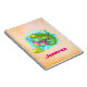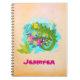 Un carnet en spirale avec une jolie illustration d'un lézard tropical vert entouré de feuilles et de fleurs d'une couleur bleu turquoise.
