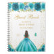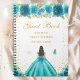 Cet élégant et glamour livre d'hôtes en sweet sixteen présente une belle princesse aux cheveux brunes et à la peau claire dans une robe turquoise bleue. Le texte combine écriture manuscrite et polices sans serif modernes pour un look élégant et sophistiqué. Les compositions florales, les papillons et les confettis d'or créent un mélange parfait de rustique et de chic. Graphiques par www.etsy.com/uk/shop/SunflowerDayLove