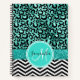 Créez votre propre nom et votre carnet de monogramme personnalisé, du papier graphique pour la classe mathématique, un carnet de croquis ou même un livre de recettes. L'image principale est un motif numérique empreinte de léopard turquoise et turquoise. Remplacez cette grande image par une photo personnelle pour créer un cadeau personnalisé. Il y a une bande de parties scintillant faux turquoise et turquoise (imprime comme effet photo). Un groupe de formes arrondies forme un mandala blanc et turquoise avec un élégant monogramme calligraphique. Au fond du design se trouve un bloc de motif en chevron noir et blanc. Un beau cadeau de retour à l'école pour elle. Un glamour moderne.