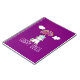 Un carnet en spirale avec une mignonne illustration d'une licorne blanche assise sur sa croûte, souriant et joyeux. Des nuages souriants et un arc-en-ciel au-dessus. Le texte dit : Heureux Vibes. Image de levage adorable. Placé sur un arrière - plan d'aquarelle rose violet.