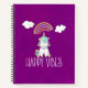 Un carnet avec une jolie illustration d'une licorne blanche assise sur sa croûte, souriant et joyeux. Des nuages souriants et un arc-en-ciel au-dessus. Texte : Happy Vibes. Image de levage adorable Placé sur un arrière - plan d'aquarelle rose violet.