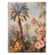 Lush palm trees stand tall amidst an assortment of colorful tropical flowers. The scene includes fruit arrangements adding a touch of abundance.