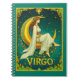 Carnet dans une femme en robes blanches coulantes, avec une fleur dans les cheveux, assise gracieusement sur une lune d'or croissant, entourée d'étoiles. Le cadre Art Nouveau orné de fleurs et le mot "VIRGO" complètent l'illustration du zodiaque céleste.