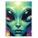 Carnet extraterrestre. Un design d'un autre monde captivant, avec un alien extraterrestre qui est avec de gros yeux bombants tenant les reflets d'autres planètes, y compris la terre en eux.