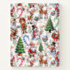 Christmas-themed pattern featuring Santa Claus, reindeer, snowmen, elves, Christmas trees, candy canes, and snowflakes on a white background