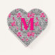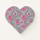 Carnet en forme de coeur dans une impression textile William Morris d'iris et de feuilles en fuchsia et rose clair, avec graphite et feuilles gris moyen / gris, sur un arrière - plan gris argent clair, avec monogramme personnalisé