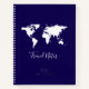 A dark blue notebook with a simple design of a white map of world, personalized with your name and initials.