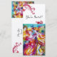 Invitation d'art fin et colorée, élégante et vibrante. Danseuses de carnaval romantiques : figures de danse artistiques, fantaisistes et expressives, belle femme blonde en costume à plumes scintillantes dansant avec un jeune Arlequin avec des ornements rouges bordeaux au verso de la carte. Peinture à l'aquarelle dans des couleurs rose vif, fuchsia, vert, rouge, bleu, jaune, avec des paillettes d'or inspirées de la Comédie de l'Art (Commedia dell'arte) et du Carnaval de Venise. C'est également un beau design pour les faire-part de mariage, les programmes, les cartes "save the date", les anniversaires de mariage, les réunions, les fiançailles romantiques, les douches de mariée, les occasions spéciales, les fêtes de fin d'année, le bal masqué de Mardi Gras, les fêtes