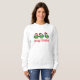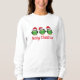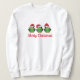 Ce sweatshirt féminin est montré avec un joli chapeau festif de Père Noël portant trio de pingouins chantant le tout d'une rangée. Haut affiché en Personnaliser blanche ou acheter tel quel.