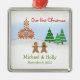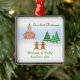 Un ornement de Noël pendant votre première année comme mari et épouse comportant une scène de neige complète avec des jeunes mariés de pain d'épice devant l'église de maison de pain d'épice où il s'est juste marié ! La neige a couvert la cour, arbres à feuillage persistant, et l'arbre de Noël accomplissent la scène. Personailze le texte.