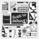 A square illustration with a white background and a grid pattern, featuring various school-related items in black and white. The items include a calculator, a notebook with the word "School!!" written on it, a maple leaf, a protractor, a palette of paints, a globe, a dictionary, a chalkboard with the words "Back to School!!" written on it, a pencil, a compass, a pen, a microscope, an hourglass, a flask, a DNA strand, an atom, an apple, a ruler, a magnifying glass, an alarm clock, and a stack of books. The style is reminiscent of a simple, graphic design, suitable for educational or back-to-school themes.