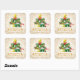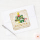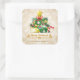 Décorez votre maison ce Noël avec notre magnifique autocollant carré de Noël. Beau arc rouge, sucre de canne, arc rouge, étoile dorée, aiguilles de pin vert, saint de Noël doré et boules de Noël doré et bleu sur flocons de neige étincelants arrière - plan lui donnent un look festif. Jolie calligraphie de Noël joyeux avec des oiseaux. Parfait pour vos cadeaux de Noël et vos enveloppes