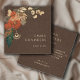 Cartes de visite floraux fantaisistes modernes avec des éléments floraux brun et vert terreux et des feuilles sur un arrière - plan en faux lin brun de cacao. Ajoutez vos coordonnées et les médias sociaux à l'arrière de la carte, sur un arrière - plan noir contrasté qui fait éclater les couleurs de la terre.