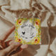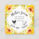 Belles pivoines d'été jaune avec feuillage associé à une illustration de poulet et un script rustique pour toutes vos informations sur un arrière - plan blanc et kraft.