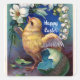 Jolie photo vintage d'un poussin éclos d'un oeuf coloré et de fleurs, figure sur cet autocollant de Pâques carré. Avec le message "Happy Easter", cet autocollant peut être utilisé pour les envois spéciaux, la décoration, la réservation de rebuts et plus encore!