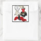 Un autocollant carré qui correspond à notre invitation "Cancan Costume 1" avec l'image d'un corset de fil noir, une robe avec un costume de cancan rouge avec une agitation de plumes noires, un collier de perles noires, une paire de bottes de cancan noir, un boa de plumes rouges, et une partie d'une horloge murale sur blanc. Bordure noire. Voir invitation et enveloppe correspondante. Voir l'ensemble de la collection Cancan Sticker dans les INVITATIONS | Section Stickers & Étiquettes.