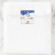This funny little Christmas snow scene on this square customizable christmas sticker shows a cute smiling santa with his toy fiilled green sack over his shoulder. Santa's funny reindeer are grazing close by the christmas sliegh. There’s a snow covered tree on the small hillside and snowflakes gently fall against the winter blue sky. The original snow scene is painted in water colour. This original festive sticker is customizable for you to personalize. The original snowman illustration is painted in water-colour.