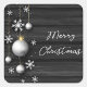 A square Christmas sticker features a dark gray wood-grain background with horizontal lines, creating a rustic texture. The words "Merry Christmas" are written in elegant, white cursive script on the right side. On the left, there are several white Christmas ornaments hanging from thin gold strings, along with scattered white snowflakes of various sizes. The largest ornament has a bright, star-like burst of light emanating from it, drawing the eye. Small white dots are dispersed throughout the background, adding a subtle, snowy effect.
