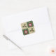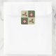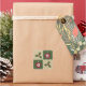 Quatre carrés verts et bronzés sont ornés de rouge décoré de flocons de neige blancs et de houx vert aux baies rouges. La couture blanche ajoute une touche décorative, donnant au motif répétitif l'aspect d'une courtepointe, créant une sensation de douceur pour les vacances de Noël.