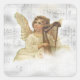 Un ange vintage joue une harpe sur un nuage. Dans l'arrière - plan est un rouleau de partitions derrière la brume des nuages.