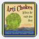 Un artichaut vert géant flotte au-dessus d'un océan bleu agité. Arti's artichoke crate étiquette était basé sur d'authentiques étiquettes publicitaires californiens. Les villes listées sont Castroville, Californie, la capitale de l'Artichoke du monde, les deux autres villes listées ; Los Encinos et Père Noël Brigita sont fictives.