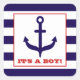 Un autocollant de baby shower avec l'illustration d'une ancre bleue sur un arrière - plan de bandes bleues. Le texte dit "C'est un garçon !"