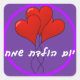Graphique mignon de trois ballons rouges en forme de coeur contre un arrière - plan violet profond, encadré dans un cercle violet clair. Avec les mots, Yom Huledet Sameach (Joyeux anniversaire, en hébreu) en texte blanc.