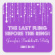 C'est la dernière course avant le ring, alors célébrez en style et rassemblez les filles avec cet autocollant amusant de fête de bachelorette. Une rangée de lumières scintillantes sont accrochées au dessus de cet autocollant avec le texte "La dernière fuite devant l'anneau !" en dessous. Ajoutez un nom, un événement, un rôle de mariage ou toute autre information contre l'arrière - plan violet brillant. Disponible en couleurs alternatives avec des produits correspondants.