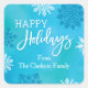 Cet élégant autocollant est idéal pour célébrer la saison des Fêtes. Il présente des flocons de neige flottants en blanc et des tons bleus. L'arrière - plan texturé ajoute une sensation douce. Il comprend les mots "Joyeuses fêtes". Cet autocollant est parfait pour compléter votre envoi de vacances. Il y a également la carte de vacances, le timbre de poste et le Étiquette de adresse correspondant.