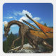 Un dragon s'installe sur un grand rocher, surplombant une forêt de pins, en direction d'un lac.