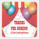 Parfait pour les sacs de cadeaux, les faveurs ou les enveloppes de cartes de remerciements, ce design amusant de carnaval de cirque présente des ballons aux couleurs vives et des confettis contre une tente de cirque rouge.