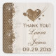 Ce carré de 1,5" en forme de grain de bois rustique et blanc lavé shabby brun et ivoire floral vintage filet et dentelle de mariage merci sticker et/ou enveloppe sceau a un coeur découpé avec des fleurs complexes et des feuilles sur elle avec un motif de dentelle de nid d d'abeille qui correspond au faire-part de mariage ci-dessous. Il est facilement customisé avec vos propres informations. ****VEUILLEZ noter que tout sera imprimé tel qu'il apparaît sur votre écran. Zazzle ne modifiera rien pour les fautes de frappe ou de mauvais alignement etc, et je ne le verrai pas une fois que vous l'aurez commandé. Si vous avez besoin d'aide sur votre libellé, envoyez-moi un courriel AVANT de commander. S'il y a d'autres articles dont vous avez besoin pour rendre votre événement spécial, veuillez envoyer votre demande par courriel à niteowlstudio@gmail.com.