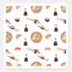 Seamless Japanese food pattern featuring sushi rolls, nigiri, ramen bowls, soy sauce bottles, and chopsticks on a black background. This colorful hand-drawn illustration is perfect for restaurant branding, menu design, food packaging, kitchen décor, wallpapers, textiles, and culinary blogs. Modern flat style with vibrant details, ideal for Asian cuisine themed projects and digital backgrounds.