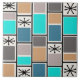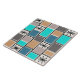 Un motif d'art abstrait moderne du milieu du siècle avec des rectangles et des étoiles Spoutnik éclatent dans de multiples couleurs de turquoise, or, beige / tan, et bleu turquoise.