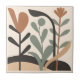 A minimalist abstract composition featuring stylized plant forms in earthy tones of terracotta, sage green, black, and warm beige. Simple, bold shapes create elegant stems, leaves, and floral elements arranged in a balanced, modern layout.