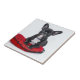 Adorable chiot taurin noir et blanc assis sur un coussin rouge royal.