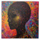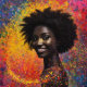 Afro Nebula Whisper – Black History Celebration. This artwork masterfully captures the essence of an Afro-descendant woman's profile, her silhouette a profound black void punctuated by a mesmerizing array of multi-coloured dots that mimic stars in a vibrant nebula. The background explodes in a symphony of reds, oranges, yellows, greens, blues, and pinks, symbolizing the infinite universe within every individual of colour. During Black History Month, this piece serves as a powerful reminder of the diverse artistic heritage gifted to the world by peoples of African descent - from the rhythmic patterns of Kente cloth to the innovative expressions in contemporary Afro-futurism.