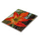 This 6” Ceramic Tile showcases the intense beauty of a flower, an Amaryllis blooming in the garden. The original photograph by ZoeSPEAK is a closeup, and the details of the flower, the shapes and color changes from the center outward are amazing. From soft shades of green blending into yellow, the bloom finishes with five outstretched petals in deep, rich oranges against a background of green leaves and muted brown wood.