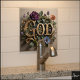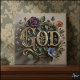 This design is special because it features the word "GOD" set in opulent, crackled gothic gold script on an antique, dark teal plaque. It is richly adorned with a garland of purple roses, thistles, and peach poppies wrapped in mossy branches. The composition creates a luxurious, vintage spiritual sign perfect for a distinctive home or religious space.