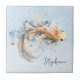 Ce magnifique carreau en céramique présente des poissons koi couleur or nageant sur un arrière - plan bleu ombre et personnalisé avec votre nom, ou supprimer pour un look propre.