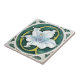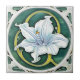 Style Art Nouveau fleur de lys bleu blanc avec une forme jaune dynamique derrière. Cercle blanc et ornements dans les coins et un fond vert foncé. Pour une bordure de carreaux de mur de salle de bain artistique élégante. L'œuvre d'art est une création d'IA.