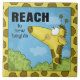 La tête d’une girafe de dessin animé piétine au sommet des arbres et la légende audacieuse dit : "Atteindre de nouveaux sommets". Certaines images sont bordées d'un motif en peau de girafe, d'une bordure noire ou d'aucune bordure. Design original par Christie Black de Creations from the Heart.