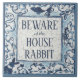 "Attention au lapin de la maison" lit ce panneau ou trivet de tuiles. N'importe quel amoureux de lapin lapin lapin appréciera ceci! Mon dessin de tuiles peintes à la main en bleu et blanc ressemble à de vieilles tuiles Delft craquelées, et la bordure et les lapins rappellent les vieux motifs de poterie Dedham. Art & design original par Tuzi Williams.