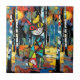 Un chat fantaisiste aux allures de vitraux géométriques se dresse dans une forêt de bouleaux très animée. L'arrière - plan présente un mélange coloré de feuilles d'automne et de tons bleus et jaunes. Photosho Art numérique