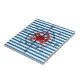 Un carrelage en céramique à motifs horizontaux bleu et blanc, sur le thème de l'océan marin, présente une boussole et un crabe rouge !
