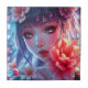Tuile d'Anime. Une belle fille aux yeux roses, fleurs et notes musicales de l'art glitchcore. Acents floraux violets et roses.
