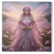 Une belle fée habillée d'une robe rose fluide et d'un collier composé d'opales et de fleurs de cosmos dans ses longs cheveux roses et ses ailes de libellules rose pâle tenant une fleur de cosmos rose se dresse dans un champ magique de fleurs de cosmos entourées de bulles contre un ciel de l'après-midi.