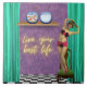 Vignette amusante et amusante inspirante avec "Vivez votre meilleure vie" en police de néon avec femme vintage en maillot de bain mignon debout sur la chaise...n'oublions pas non plus de noter que le poisson rouge saute de la foule dans son propre bol !