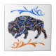 Il s'agit d'une tuile décorative unique qui présente une silhouette de bison de style mosaïque artistique. La motif en mosaïque est décorée d'un motif floral dans les tons bleu roi, orange et blanc sur un arrière - plan noir. Au-dessus de l'image de bison se trouve un tourbillon décoratif bleu, et en dessous, un tourbillon orange assorti.